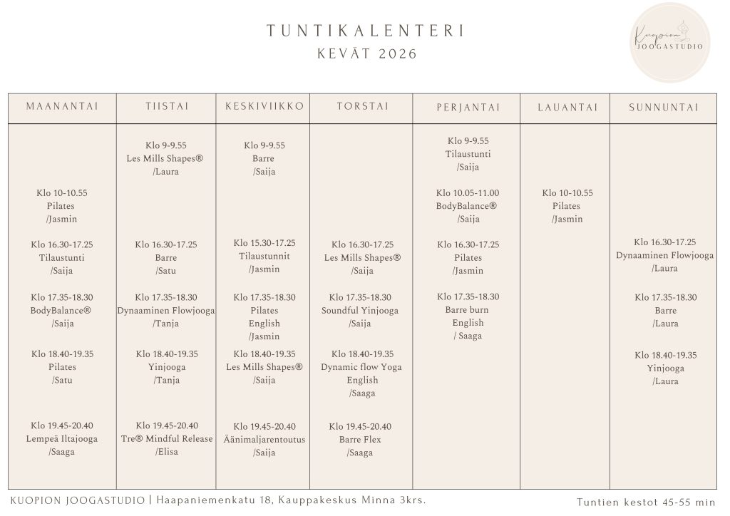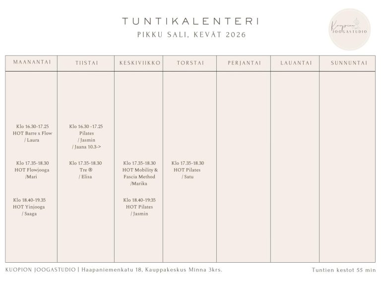Tervetuloa Kuopion Joogastudioon, jossa kiire vaihtuu rauhaan ja kehosi sekä mielesi löytävät tasapainon. Olitpa aloittelija tai kokenut joogan harrastaja, tarjoamme sinulle täydellisen ympäristön palautumiseen, vahvistumiseen ja elinvoiman löytämiseen. Monipuolinen tuntitarjontamme varmistaa sen, että jokainen löytää oman suosikkinsa. Ohjaajamme ovat kokeneita ammattilaisia, joilla on useiden vuosien kokemus ohjauksista.